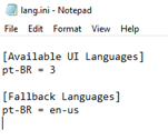 - Edited the Lang.ini file that was created. I removed the en-US line and changed the pt-BR line to be “pt-BR = 3”